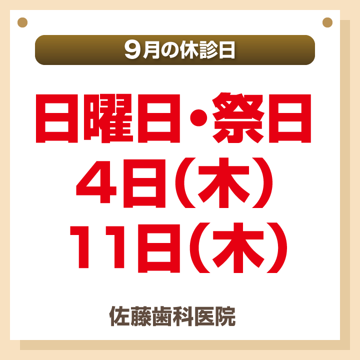 9月休診日情報|千葉市中央区の歯医者をお探しなら千葉みなと駅から徒歩15分の佐藤歯科医院まで。