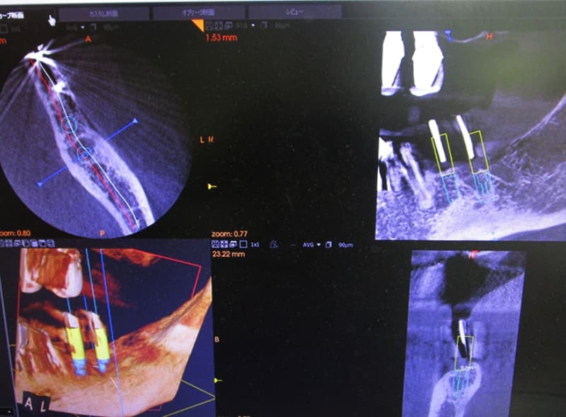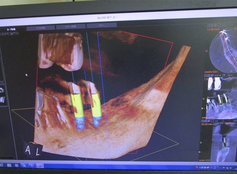 インプラント治療では、事前の検査によって顎の骨の状態を詳しく調べ、その結果を元に精密な診断および治療計画の立案を行うことが大切です。そこで当院では、表から見えない部分の状態を立体画像で取得できる歯科用CT(トロフィー社)を導入し、精密な診断に役立てています。