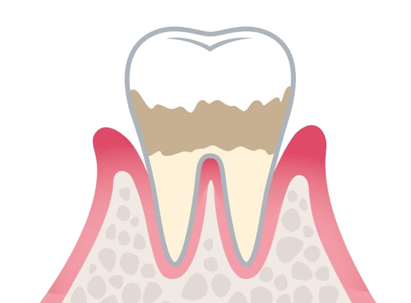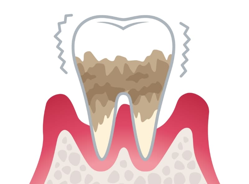 初期は歯ぐきの炎症(歯肉炎)から始まりますが、痛みなどの自覚症状はほとんどありません。放置すると炎症が歯を支える骨(歯槽骨)にまで及び、骨が溶かされていきます。