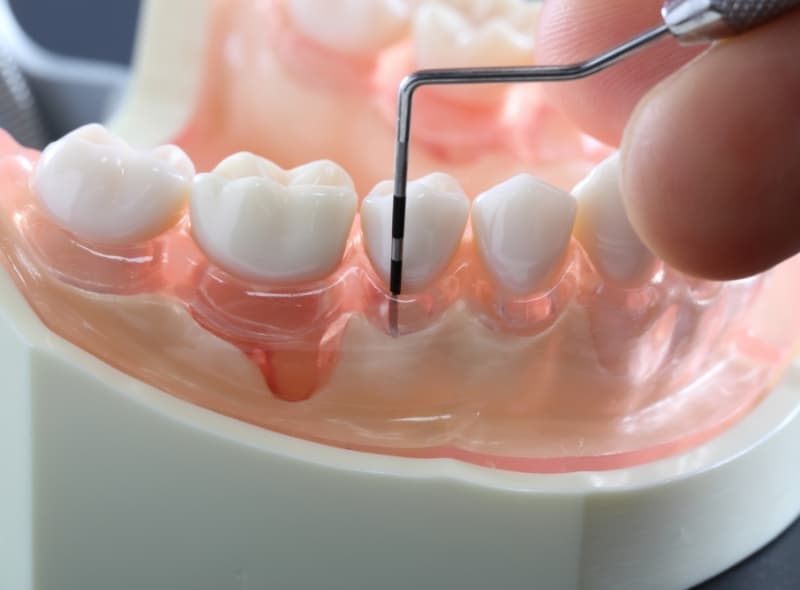 歯周病検査では、主に3つの項目を確認します。まず、専用の器具(プローブ)を用いて歯周ポケットの深さを測定。次に、プローブを挿入した際の出血の有無で炎症の状態を評価します。最後に、歯をピンセットで保持し、動かした際の揺れの程度(動揺度)を診ることで、歯周病の進行レベルを総合的に診断します。