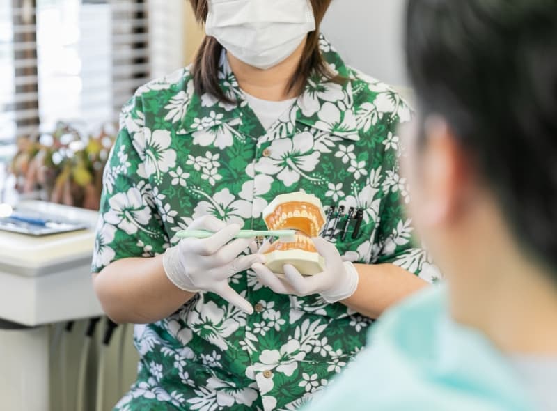 当院では定期検診の際に、歯科医師による口腔内のチェックに加え、口腔衛生のプロフェッショナルである歯科衛生士がお口のクリーニングを行っています。ご自宅でのケアでは落とし切れないプラーク(歯垢)や歯石を徹底的に除去することで、口腔内を健康に維持することができるのです。また同時に、セルフケアのコツなどもお教えしています。