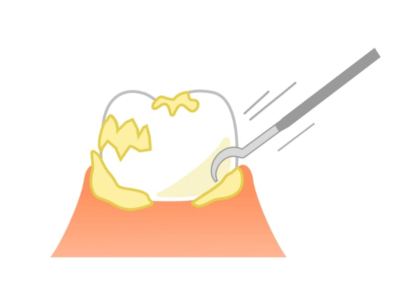 歯石は歯ブラシでは除去できません。メインテナンスでは、この歯石をスケーラー等の器具を使って慎重に除去します。